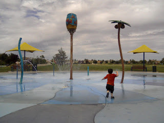 This past Friday I took the day off and spent it with Aaron (translation: mom & dad were out of town). We met Josh downtown for lunch and then headed to this park I heard about from other mommies in the area. It was a really nice, well manicured park with a play area for big kids and another for little ones. And it has this really awesome water feature area that runs every day! Since the day was a bit cooler and overcast, the park was virtually empty but that didn't stop Aaron one bit. He played on all the big kid equipment and even went down the big slide all by himself! He stopped for some playtime in the water and then went back to the slide and bridges. After the park and a quick change of clothes in the parking lot, we went to get some yummy Pinkberry. It was a great afternoon!